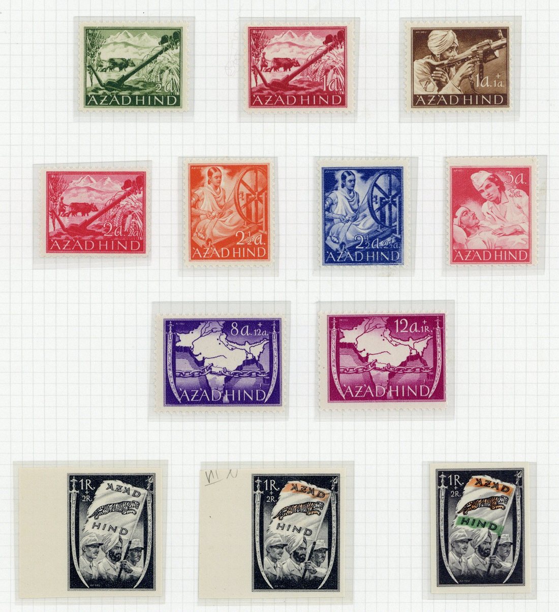 1943 imperforate set of ten with four additional values to 8a.+12a., 1r. black and 1r. black and orange, and perforated set of nine, fine unmounted mint. Michel cat. €1,430
