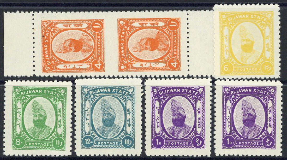1937 4a. orange vertical pair, variety imperforate between, and 6a. to 1r. (2, one variety "Rs"), fresh mint; one 4a. with tiny inclusion though generally fine. Cat. £380