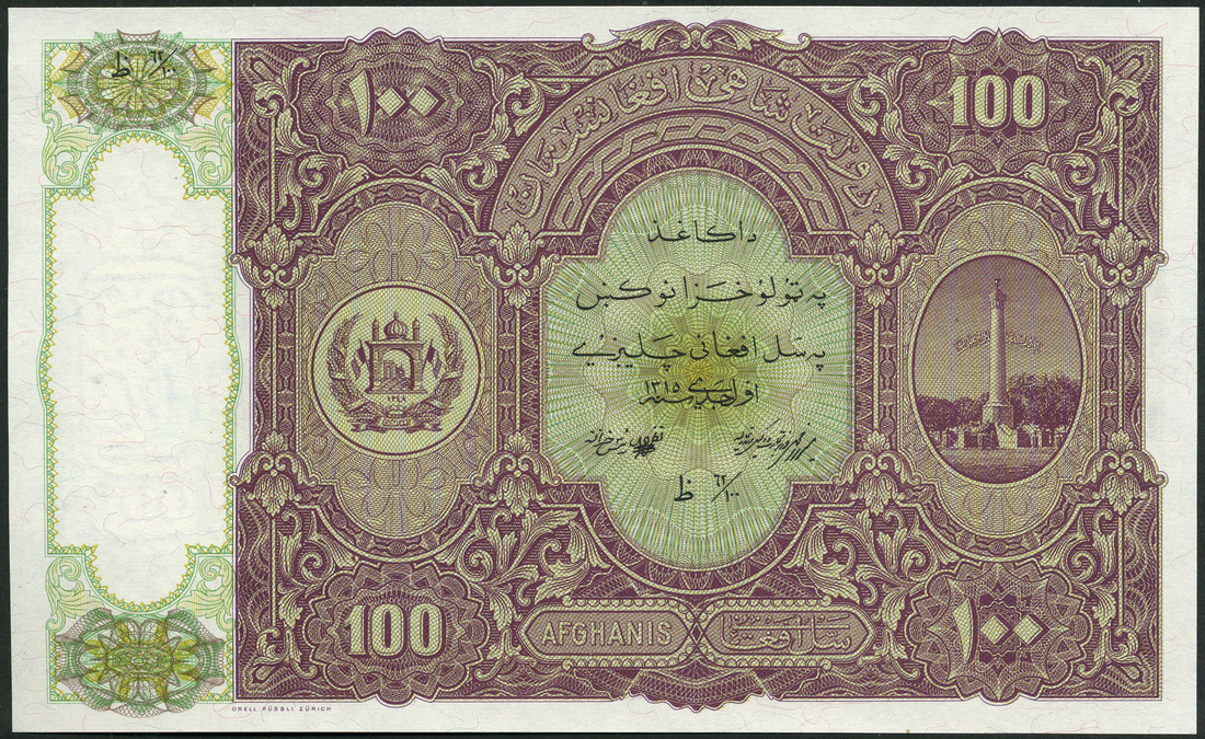 (x) Afghanistan Ministry of Finance, 100 afghanis, 1936, no serial numbers, purple and green on multicolour underprint, Independence Monument at right, arms at left, value at each corner