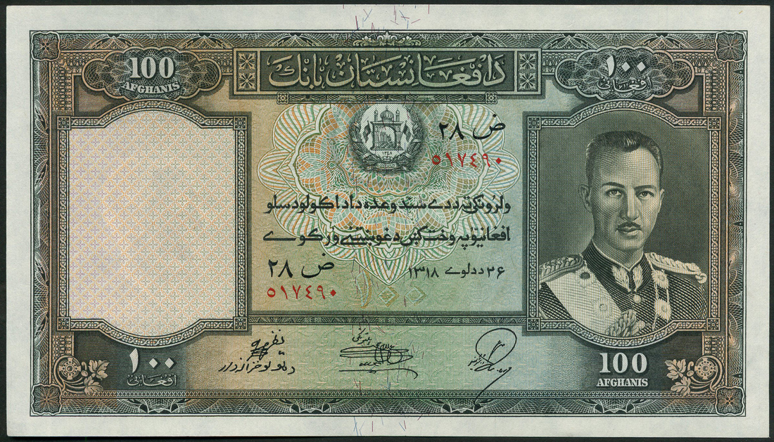 (x) Da Afghanistan Bank, 2, 5, 10, 50 and 100 afghanis, 1318 (1939), brown, green, red-brown, blue and olive green respectively, all with King Muhammad Zahir at right, value at each corner