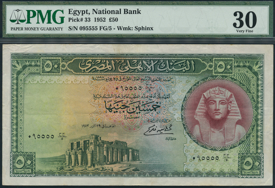 (x) National Bank of Egypt, £50, 1952, serial number HJ/5 095555, green and purple on multicolour underprint, Tutankhamen at right, temple ruins at low left, value at each corner, signature of M.Amin Fekry, reverse green, view of Cairo