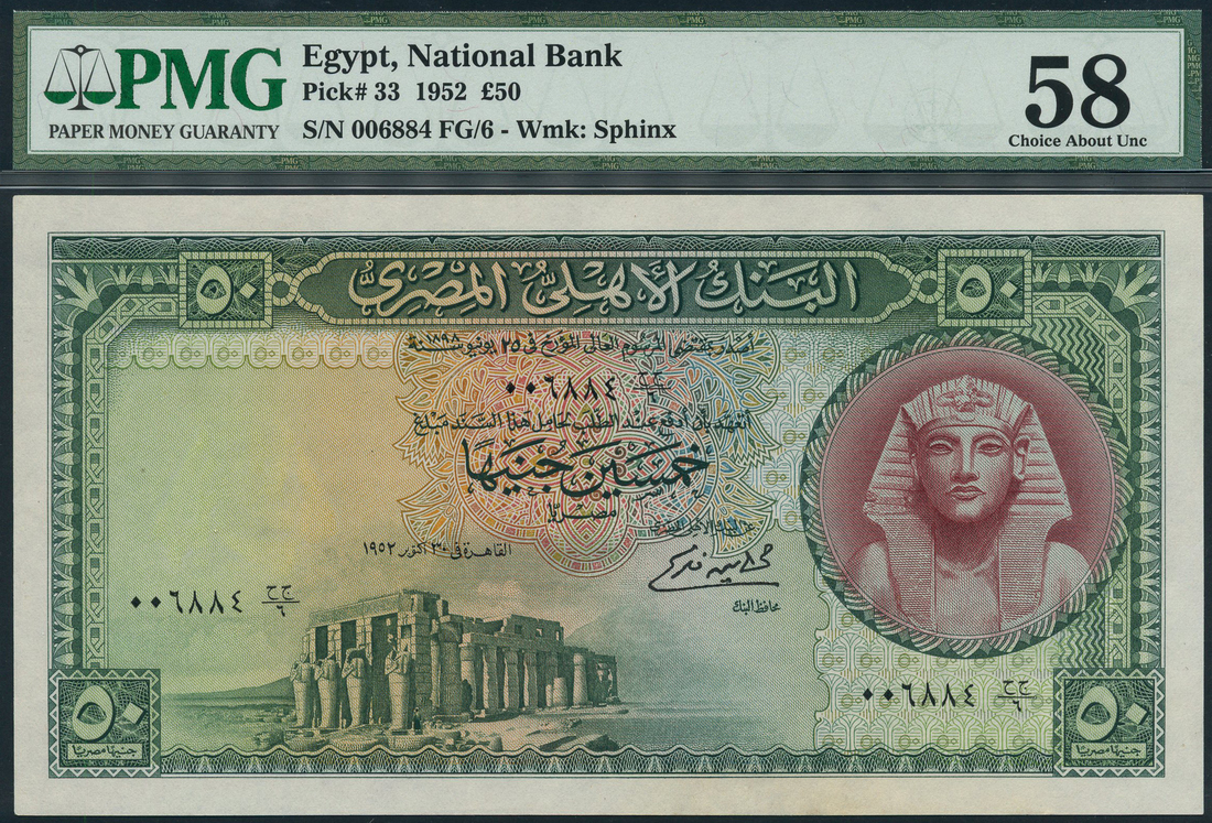 (x) National Bank of Egypt, £50, 1952, serial number HJ/5 006884, green and purple on multicolour underprint, Tutankhamen at right, temple ruins at low left, value at each corner, signature of M.Amin Fekry, reverse green, view of Cairo