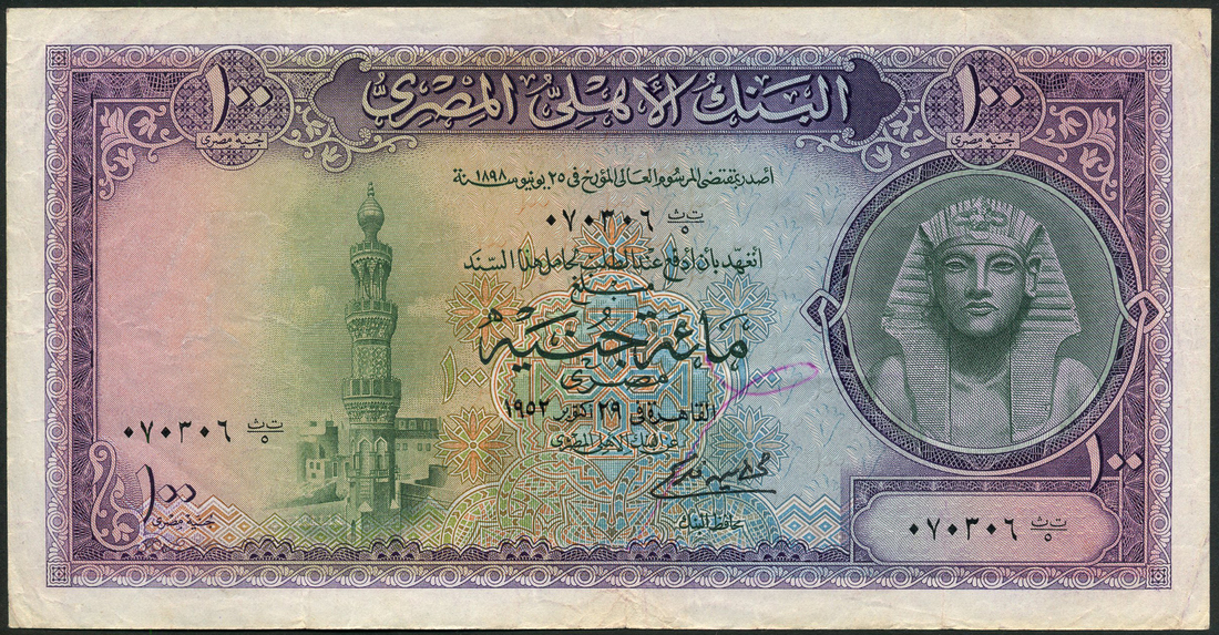 (x) National Bank of Egypt, £100, 1952, serial number 070306, purple on multicolour underprint, Tutankhamen at right, minaret at left, value at each corner, signature of M.Amin Fekry, reverse purple, Mosque at centre