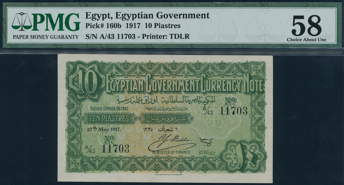 (x) Egyptian Government Currency Note, 10 piastres, 27 May 1917, serial number A/43 11703, green on orange and green underprint, value at top left and low right, reverse blue, Colossi of Memnon at centre