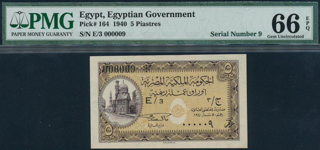 (x) Egyptian Government Currency Note, 5 piastres, 1940, serial number E/3 000009, brown on yellow underprint, value at low left and right and each corner, reverse dark blue