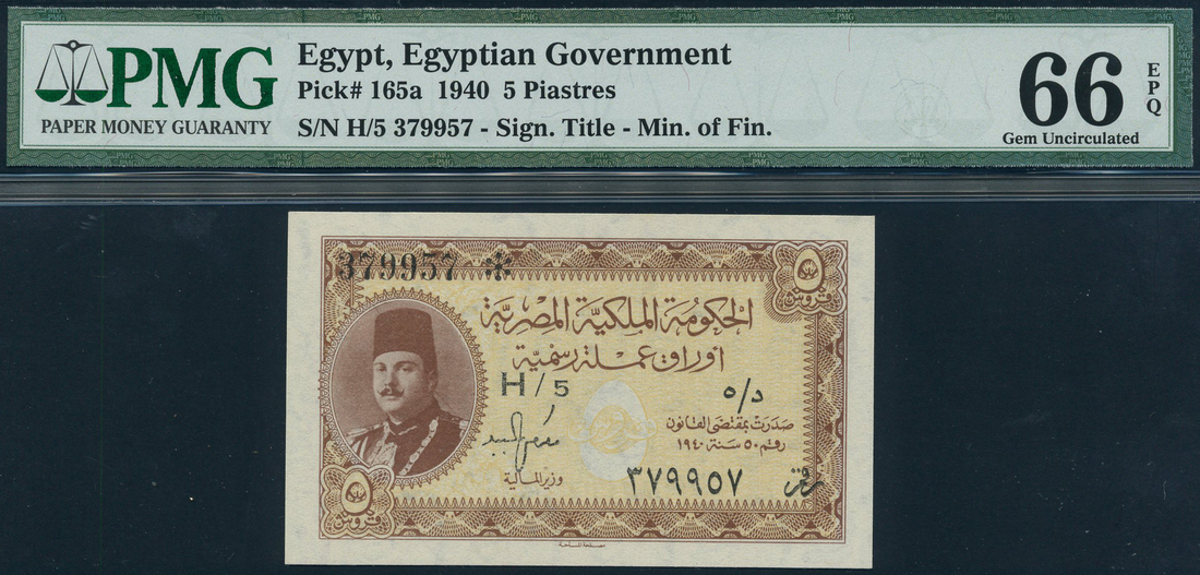(x) Egyptian Government Currency Note, 5 piastres, 1940, serial number H/5 379957, brown on tan underprint, King Farouk at left, value at low left and top right, reverse dark blue