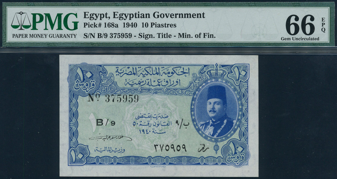 (x) Egyptian Government Currency Note, 10 piastres, 1940, serial number B/9 375959, blue on green underprint, King Farouk at right, value at each corner, reverse green and pink, value at each corner