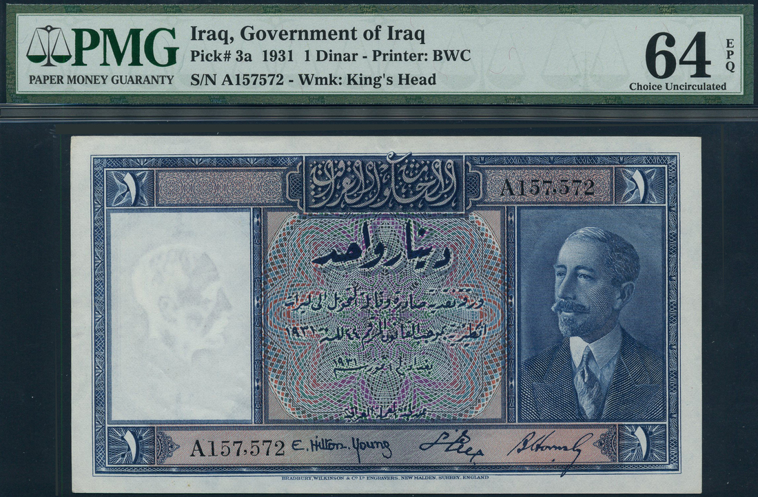 (x) Government of Iraq, 1 dinar, L.1931 (1931-32), serial number A 157,572, blue on multicolour underprint, King Faisal I at right, value at each corner, reverse blue, value at left, and top left and right