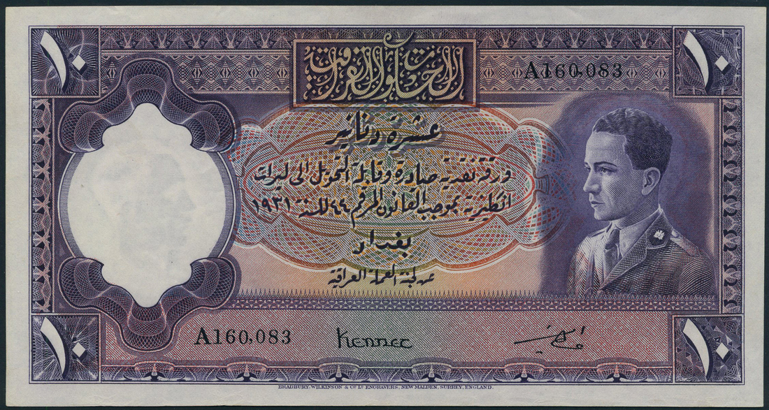 (x) Government of Iraq, 10 dinars, L.1931 (1934-40), serial number A160,083, purple on multicolour underprint, King Ghazi at right, value at each corner