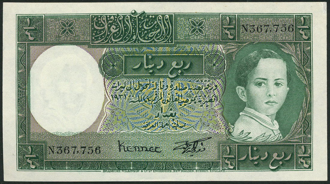 (x) Government of Iraq, 1/4 dinar, L.1931 (1942), serial number N367,756, green on multicolour underprint, King Faisal II as a baby at right, value at each corner