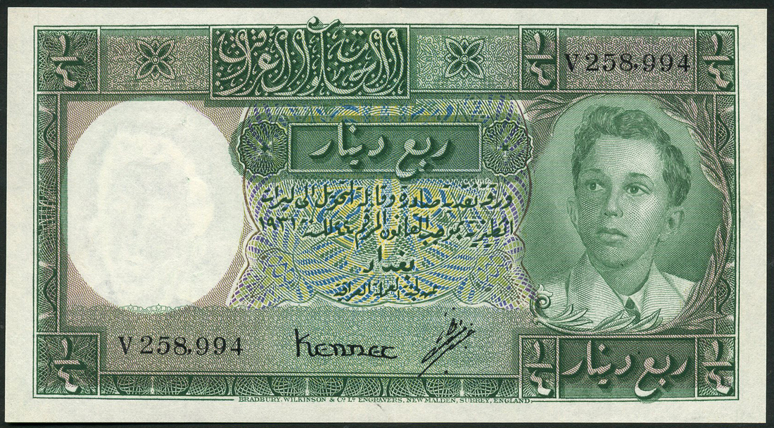 (x) Government of Iraq, 1/4 dinar, L.1931 (1948), serial number V258,994, green on multicolour underprint, King Faisal II as a youth at right, value at each corner