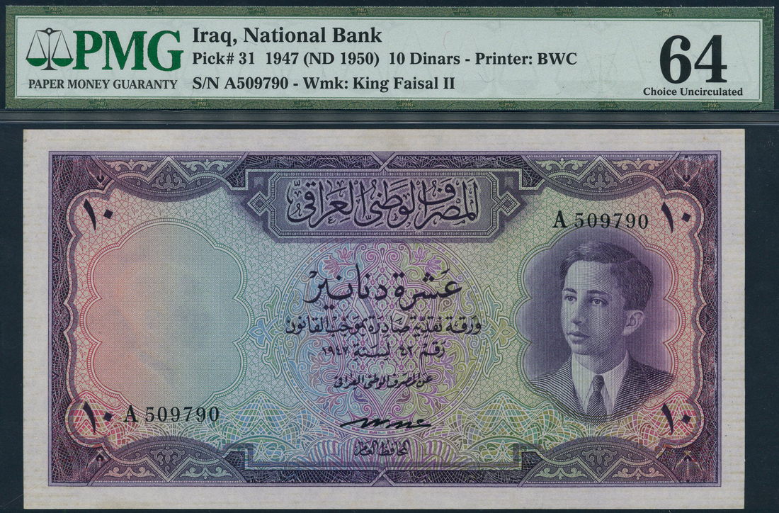 (x) National Bank of Iraq, 10 dinars, 1947, serial number A509790, purple on multicolour underprint, King Faisal II as a youth at right, value at each corner, reverse purple, winged bull statue at centre