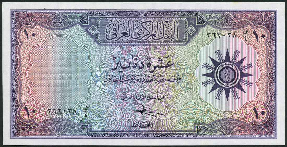 (x) Central Bank of Iraq, a small group of post-kingdom issues, comprising 10 dinars, 1959, purple, arms at right, 1/2 dinar, 1971, brown, 1 dinar (2), 1971, blue, 1/2 dinar, 1973, brown, and 10 dinars, 1973, purple
