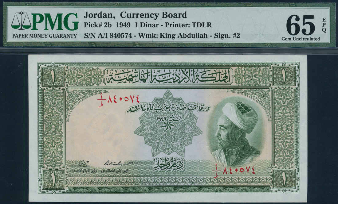 (x) The Hashemite Kingdom of the Jordon, 1 dinar, L.1949 (1950), serial number A/1 840574, green on light orange and blue, King Abdullah at left, ornate border, reverse, archaeological site at Jerash, column at left and right