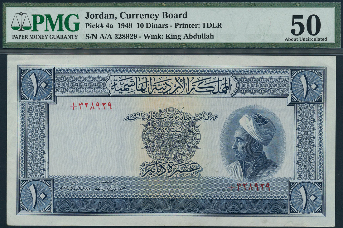 (x) The Hashemite Kingdom of the Jordan, 10 dinars, L.1949 (1950), serial number A/A328929 blue print, King Abdullah at right, value at each corner, Sulaiman Sukar and Abdul H, Al Haimak signatures, reverse blue, Treasury at Petra at centre