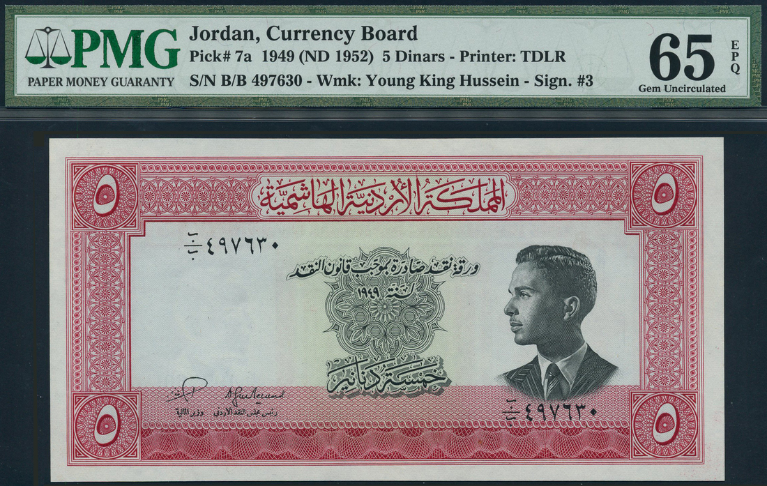 (x) The Hashemite Kingdom of Jordan, 5 dinars, L.1949 (1952), serial number B/B 497630, red print, King Hussein at right, value at each corner, reverse red, Treasury at Petra at centre, Anestas Hananeyah and Baha Al-Din Toukan signatures,