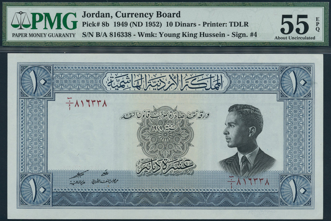 (x) The Hashemite Kingdom of Jordan, 10 dinars, L.1949 (1952), serial number B/A816338, blue print, King Hussein at right, value at each corner, , reverse blue, Treasury at Petra at centre, Anestas Hananeyah and Baha Al-Din Toukan signatures