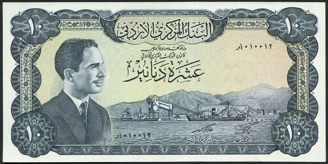 (x) Central Bank of Jordan, a full set from the second issue comprising 1/2 dinars, brown and 1 dinars, green, with Mohamad Nuri Shafik and Said Al Nabulsi signatures, 5 dinars, red, with Salem Massadeh and Said Al Nabulsi signatures, 10 dinars, blue, with Hashim Al Jayoosi and Khalil Al Salem signatures