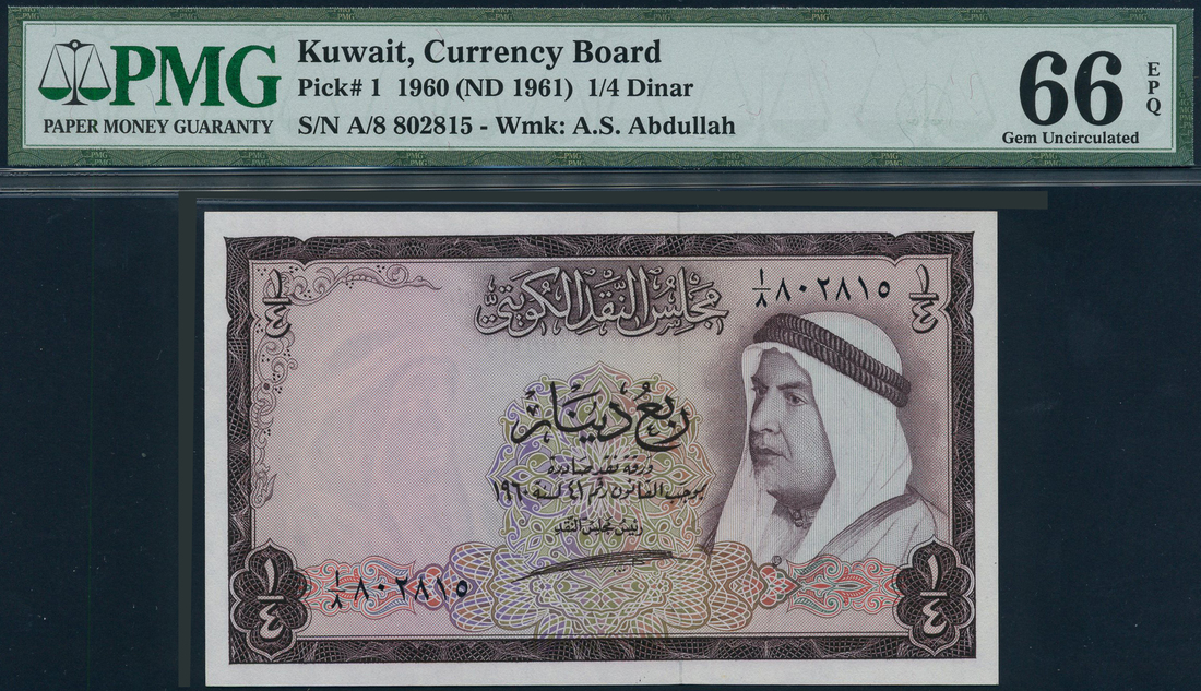 (x) Kuwait Currency Board, 1/4 dinar, 1960, serial number A/8 802815, brown and multicoloured, Amir Shaikh Abdullah at right, value at each corner, reverse purple, the Port of Kuwait at left, value at each corner