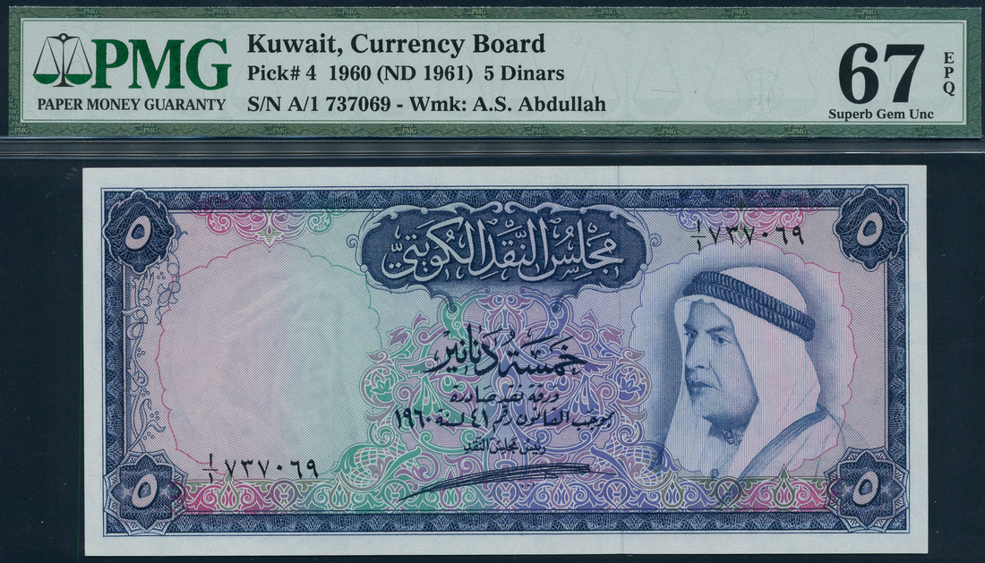 (x) Kuwait Currency Board, 5 dinars, L.1960 (1961), serial number A/1 737069, blue on multicolour, Amir Sheikh Abdullah al-Salem al-Sabah signature and portrait at right, reverse blue, street view