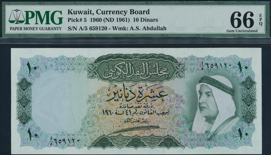(x) Kuwait Currency Board, 10 dinar, law of 1960 (1961), serial number A/5 659120, green and multicoloured, Amir Sheikh Abdullah al-Salem al-Sabah at right, reverse green, sailing dhow at centre, Amir Sheikh Abdullah al-Salem al-Sabah signature