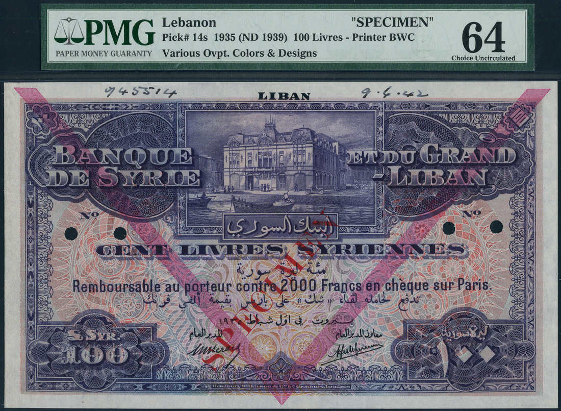 (x) Banque du Syrie et du Grande-Liban, Lebanon, specimen/proof 100 livres, L.1930 (1942), no serial number, purple on multicolour underprint, Bank of Beyrouth building at top centre, value at each corner, reverse brown on multicolour underprint, view of town and mountains at centre, purple V overprint, four cancellation holes, red SPECIMEN overprint