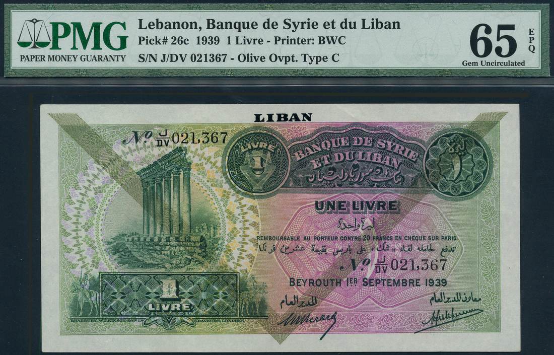 (x) Banque de Syrie et du Liban, Lebanon, 1 livre, 1 September 1939, serial number J/DV 021,367, green on lilac and yellow underprint, Pillars of Baalbek at left, reverse red on olive and orange underprint, city view at centre, overprint V shaped lines