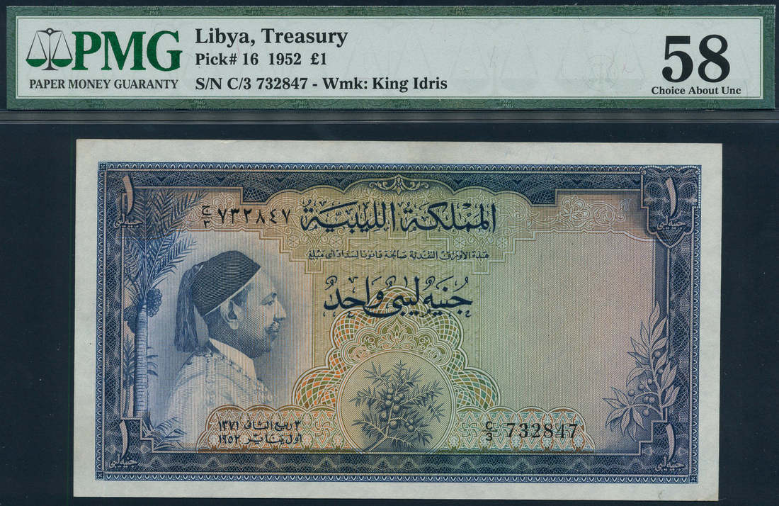(x) Kingdom of Libya, 1 pound, 1 January 1952, serial number C/3 732847, blue on multicolour underprint, King Idris at left, value at each corner, reverse blue, value at centre and corners