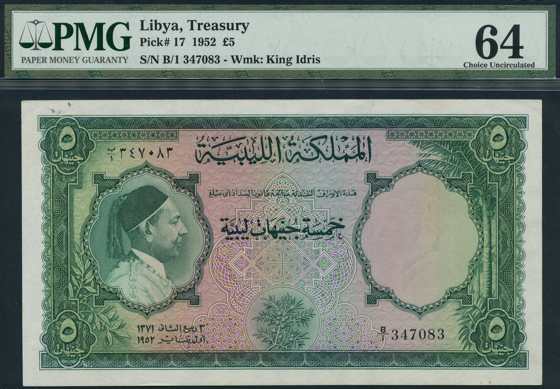 (x) Kingdom of Libya, 5 pounds, 1 January 1952, serial number B/1 347083, green on multicolour underprint, King Idris at left, value at each corner, reverse green, value at centre and corners