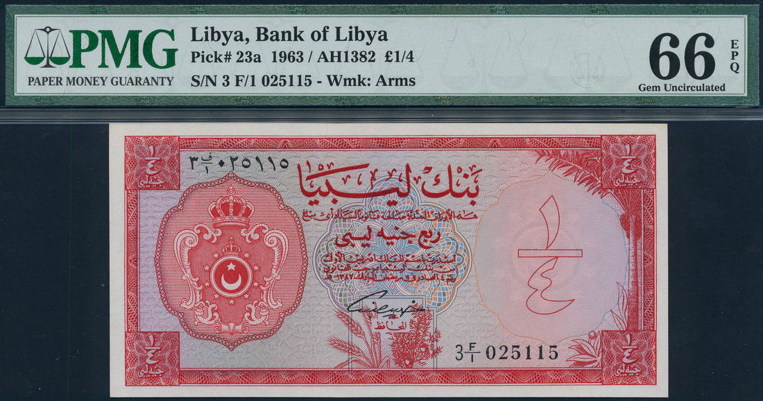 (x) Bank of Libya, 1/4 pound, 5 February 1963, serial number 3 F/1 025115, red on multicolour underprint, arms at left, value at right and each corner, reverse red, value at centre and corners