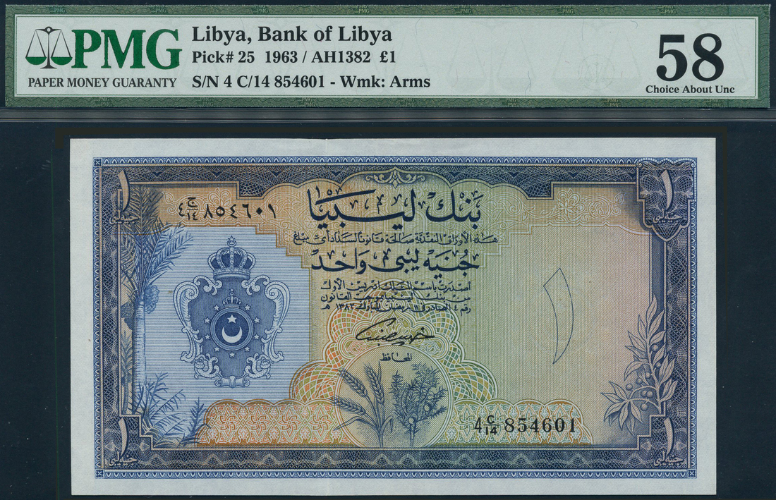 (x) Bank of Libya, 1/4, 1/2, and 1 pound, 5 February 1963, red, purple and blue respectively, on multicolour underprint, arms at left, value at right and each corner, reverse red, value at centre and corners