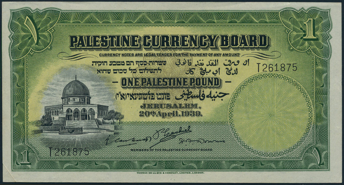 (x) Palestine Currency Board, £1, 20 April 1939, serial number T261875, black, green and yellow, Dome of the Rock at left, value in each corner and at centre, reverse, Tower of David at centre