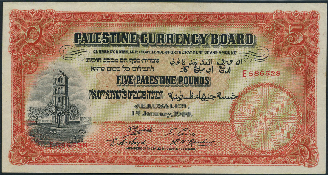 (x) Palestine Currency Board, £5, 1 January 1944, serial number E586528, black, orange and green, Crusaders Tower at Ramleh at left, value in each corner and at centre, reverse, Tower of David at centre