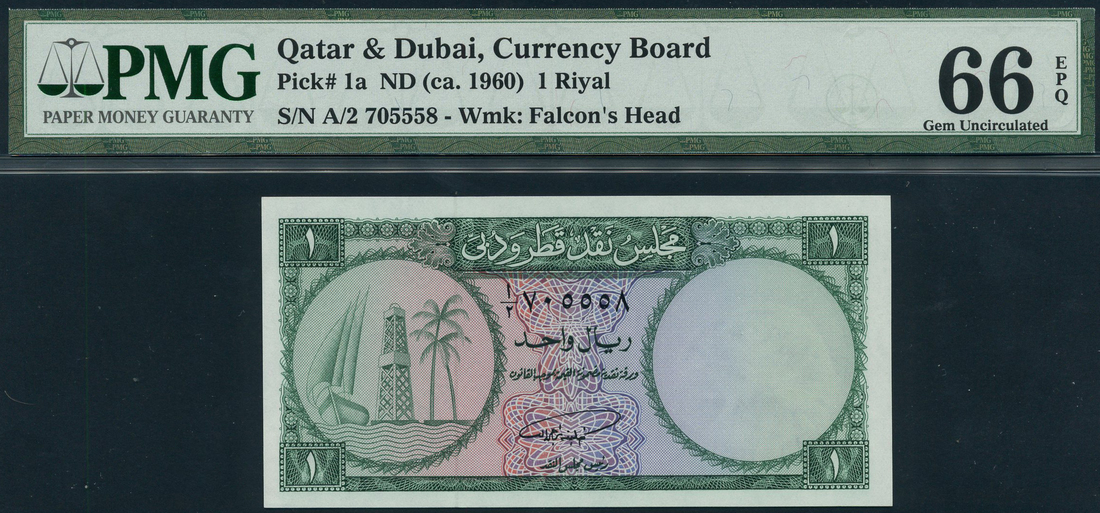 (x) Qatar & Dubai Currency Board, 1 riyal, ND (1966), serial number A/2 705558, green on multicolor underprint, dhow, oil derrick and palm trees at left, value at each corner, reverse, value at centre and top left and right