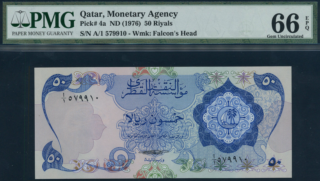 (x) Qatar Monetary Agency, 50 riyals, 1973, serial number A/1 579910, blue on multicolour underprint, dhow and palms at right, value at each corner, reverse blue, oil rig at left