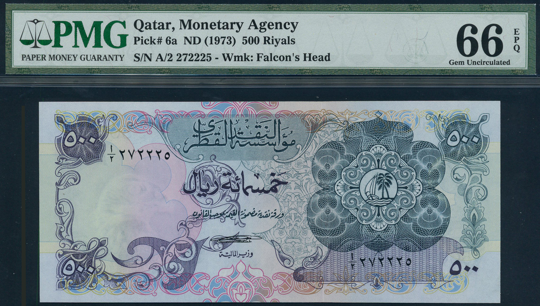 (x) Qatar Monetary Agency, 500 riyals, 1973, serial number A/2 272225, teal on multicolour underprint, dhow and palms at right, value at each corner, reverse teal, Mosque of the Sheikhs at left