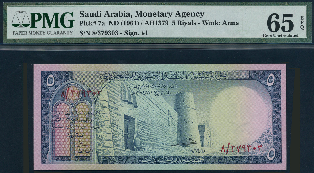 (x) Saudi Arabia Monetary Agency, 5 riyals, AH 1379 (1961), red serial numbers 8/379303, blue and multicoloured, fortress at centre, arms top left and right, Najjeb Ibrahim Slha signature, reverse blue and pale lilac, arms at centre, value top left and right