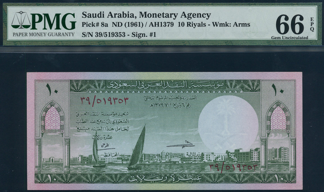 (x) Saudi Arabia Monetary Agency, 10 riyals (2), AH 1379 (1961), red serial number 39/519353, green and pink, dhows in the harbour at Jeddah at centre, value at each corner, Anwar Ali and Tallal bin Abdul Aziz signatures, reverse green, arms at centre
