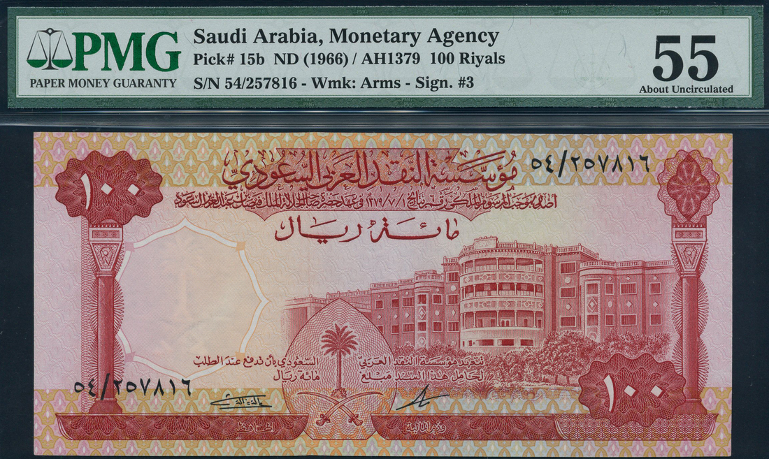 (x) Saudi Arabia Monetary Agency, 100 riyals, AH 1379 (1968), black serial number 54/257816, red and multicoloured, Government building right centre, value top left and low right, arms at centre, signature 2, 1 riyal, AH 1379 (1968), serial number 72/689065, purple and multicolour, ministry of foreign affairs building at centre