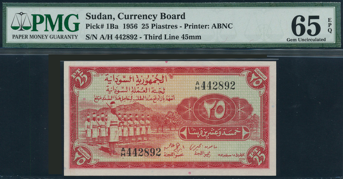 (x) Sudan Currency Board, 25 piastres, 1956, serial number A/H 442892, red on orange and green underprint, soldiers with rifles on parade at left, value at right and each corner, reverse red, soldier riding camel at centre