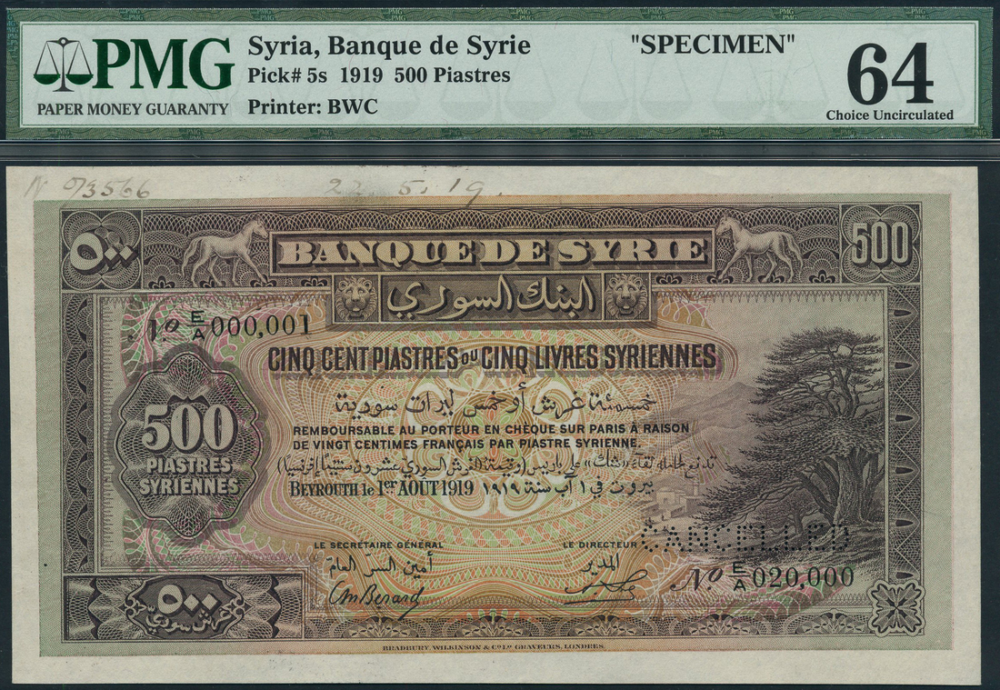 (x) Banque de Syrie, printer's archival specimen 500 Piastres, 1 August 1919, serial number run E/A 000,001 to E/A 020,000 , brown-purple and multicoloured, value in guilloche at left, cedar tree at right, reverse deep grey-green, brown and yellow, view of Beirut harbour at centre, value at left and right, perforated CANCELLED