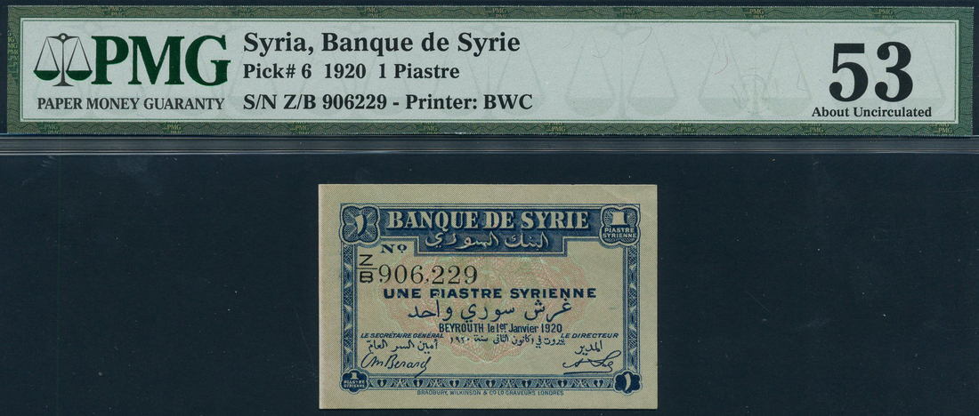 (x) Banque de Syrie, 1 piastre, 1 January 1920, serial number Z/B 906,229, blue on pink and green underprint, value at each corner, reverse brown, Pillars of Baalbek at centre