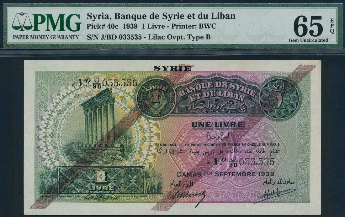 (x) Banque de Syrie et du Liban, Syria, 1 livre, 1 September 1939, serial number J/BD 033,535, green on multicolour underprint, Pillars of Baalbek at left, value at low left and top centre and right, reverse red on orange and green underprint, coastal city view at centre, two diagonal red lines overprint