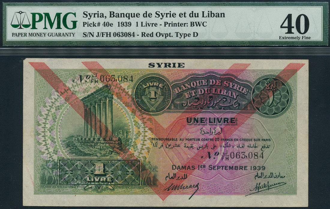 (x) Banque de Syrie et du Liban, Syria, 1 livre, 1 September 1939, serial number J/FH 063,084, green on multicolour underprint, Pillars of Baalbek at left, value at low left and top centre and right, reverse red on orange and green underprint, coastal city view at centre, two red V shaped lines overprint