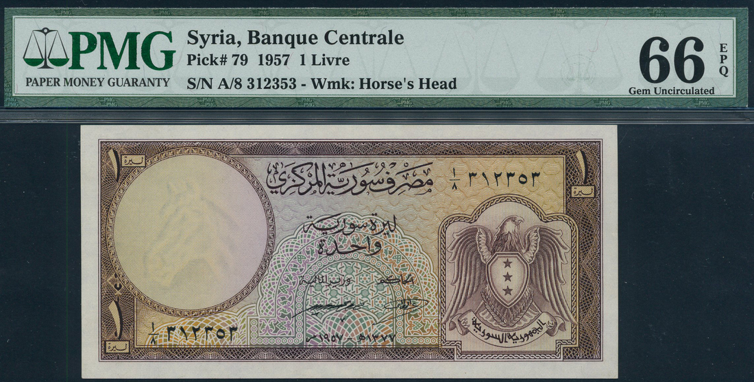 (x) Institut d'Emission de Syrie, 1 livre, 1950's first issue, serial number A/5 256568, and Banque Centrale de Syrie, 1 livre, 1957, serial umber A/8 312353, both brown, arms at right, value at corners, reverse Omayyad Mosque at centre