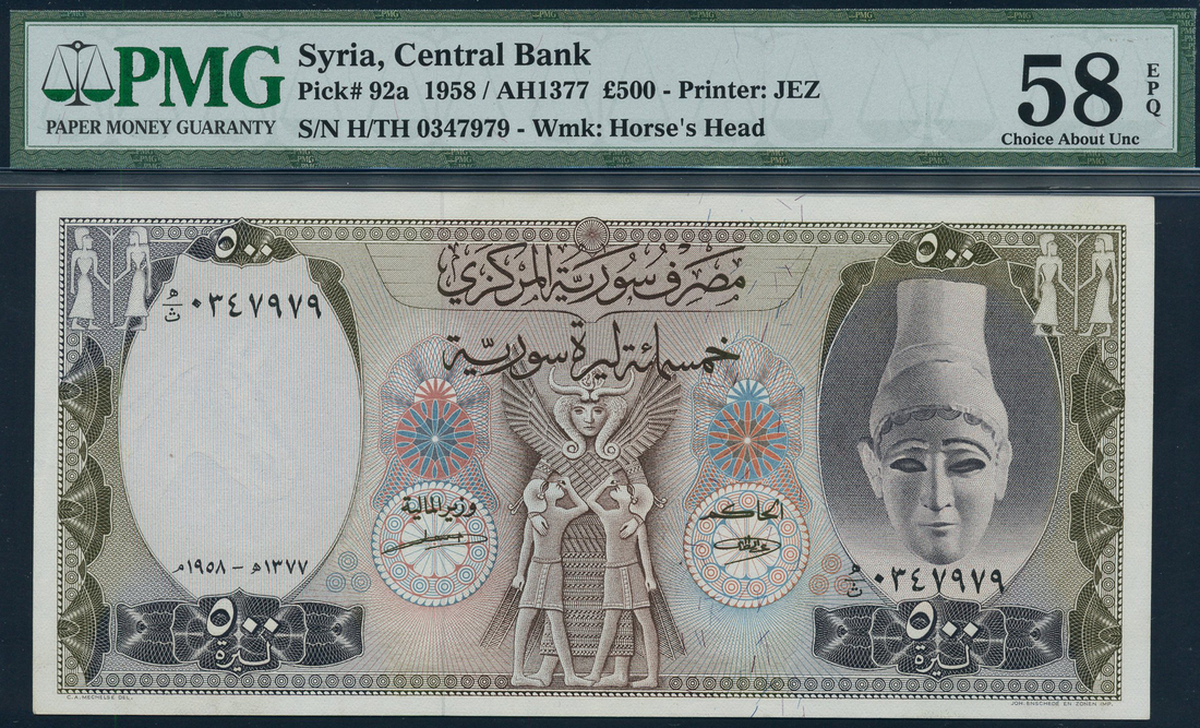 (x) Central Bank of Syria, 500 pounds (2), 1958 and 1976, serial numbers H/T 0347979 and T/1 622789, black and brown on multicolour underprint, head at right, relief at centre, reverse ancient religious wheel and cuneiform tablet