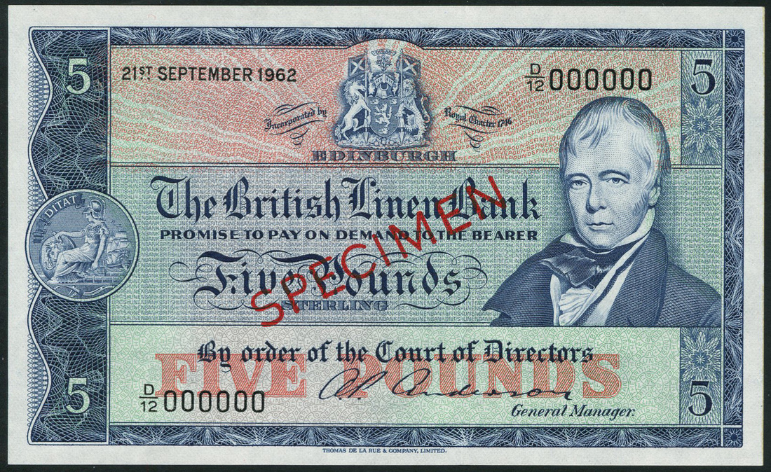 British Linen Bank, specimen £5, 21 September 1962, serial number D/12 000000, blue on red and light yellow sunburst underprint, arms top centre flanked by value in tablets, ornate panel at left, portrait Sir Walter Scott at right, reverse, elaborate blue panel with DITAT emblem at centre, printed Anderson signature, De la Rue printing