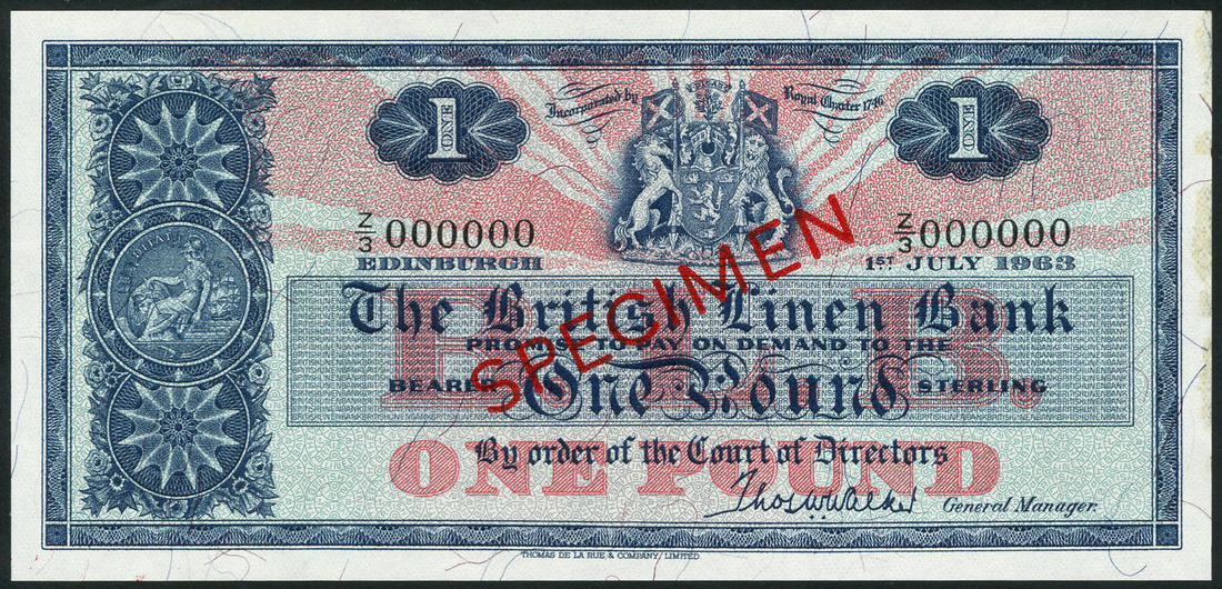 British Linen Bank, specimen £1 (3), 1 July 1963, 13 June 1967 (2), serial numbers Z/3 000000, P/4 000000, third without serial, blue on red and light yellow sunburst underprint, arms top centre flanked by value in tablets, ornate panel at left, red "B.L.B" at centre, reverse, elaborate blue panel with DITAT emblem at centre, printed Walker signature, De la Rue printing
