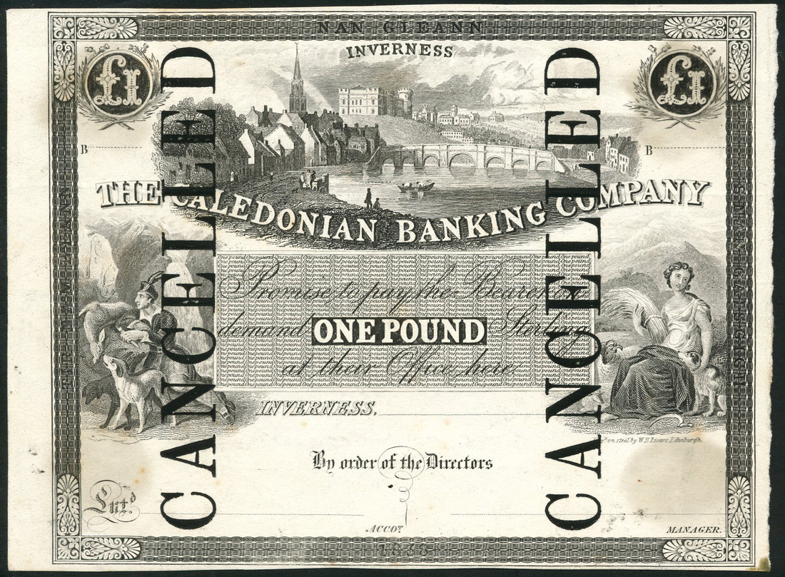 Caledonian Banking Company, proof £1 on card, ND (ca 1838), black and white, view of Inverness with the castle and the river Ness top centre, allegorical male figure at left, maiden (Abundance) low right, value in black circular frame top left and right, plate B