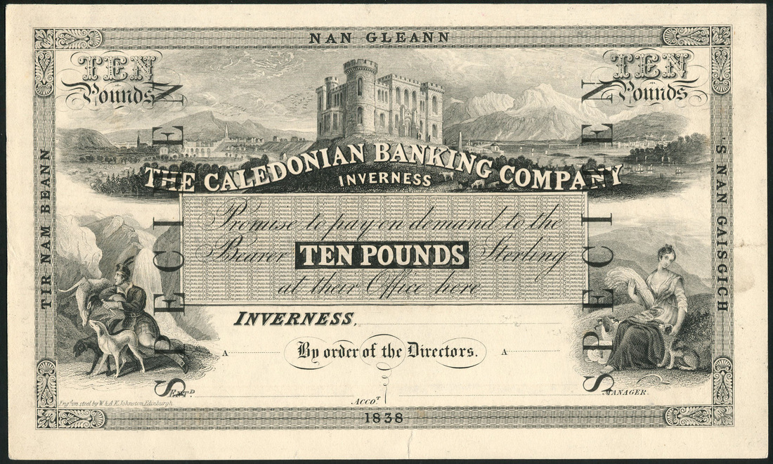 Caledonian Banking Company, proof £10 on card, 1838 (Johnston engraving so 1863), black and white, view of Inverness with the castle and the river Ness top centre, allegorical male figure at left, maiden (Abundance) low right, value in black circular frame top left and right, plate A,
